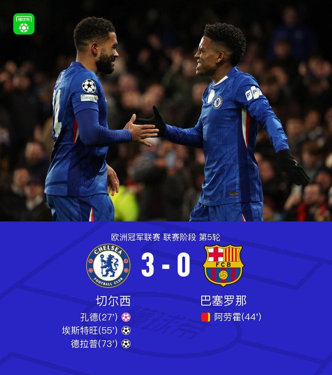 北京时间11月26日,欧洲冠军联赛联赛阶段第5轮,切尔西迎战巴塞罗那。上半场恩佐两次破门被吹,孔德门前打入乌龙球,阿劳霍两黄变一红被罚下,下半场桑托斯破门被吹越位,埃斯特旺打入一球,德拉普推射锁定胜局。最终全场比赛结束,切尔西以3比0战胜巴塞罗那。